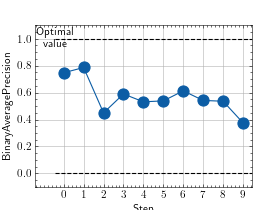 >>> # Example plotting multiple values >>> import torch >>> from torchmetrics.classification import BinaryAveragePrecision >>> metric = BinaryAveragePrecision() >>> values = [ ] >>> for _ in range(10): ... values.append(metric(torch.rand(20,), torch.randint(2, (20,)))) >>> fig_, ax_ = metric.plot(values)
