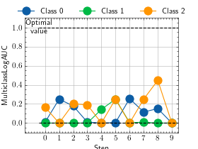 >>> # Example plotting multiple values >>> import torch >>> from torchmetrics.classification import MulticlassLogAUC >>> metric = MulticlassLogAUC(num_classes=3) >>> values = [ ] >>> for _ in range(10): ... values.append(metric(torch.randn(20, 3), torch.randint(3, (20,)))) >>> fig_, ax_ = metric.plot(values)