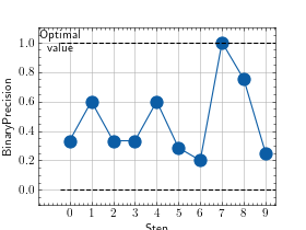 >>> from torch import rand, randint >>> # Example plotting multiple values >>> from torchmetrics.classification import BinaryPrecision >>> metric = BinaryPrecision() >>> values = [ ] >>> for _ in range(10): ... values.append(metric(rand(10), randint(2,(10,)))) >>> fig_, ax_ = metric.plot(values)