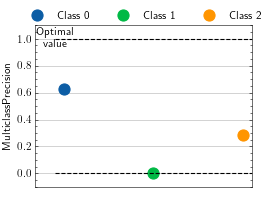 >>> from torch import randint >>> # Example plotting a single value per class >>> from torchmetrics.classification import MulticlassPrecision >>> metric = MulticlassPrecision(num_classes=3, average=None) >>> metric.update(randint(3, (20,)), randint(3, (20,))) >>> fig_, ax_ = metric.plot()