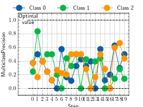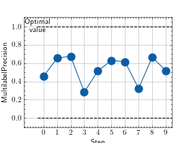 >>> from torch import rand, randint >>> # Example plotting multiple values >>> from torchmetrics.classification import MultilabelPrecision >>> metric = MultilabelPrecision(num_labels=3) >>> values = [ ] >>> for _ in range(10): ... values.append(metric(randint(2, (20, 3)), randint(2, (20, 3)))) >>> fig_, ax_ = metric.plot(values)