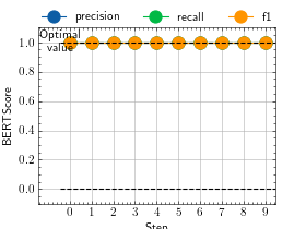 >>> # Example plotting multiple values >>> from torch import tensor >>> from torchmetrics.text.bert import BERTScore >>> preds = ["hello there", "general kenobi"] >>> target = ["hello there", "master kenobi"] >>> metric = BERTScore() >>> values = [] >>> for _ in range(10): ... val = metric(preds, target) ... val = {k: tensor(v).mean() for k,v in val.items()} # convert into single value per key ... values.append(val) >>> fig_, ax_ = metric.plot(values)