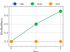 >>> # Example plotting multiple values >>> import torch >>> from torchmetrics.wrappers import MinMaxMetric >>> from torchmetrics.classification import BinaryAccuracy >>> metric = MinMaxMetric(BinaryAccuracy()) >>> values = [ ] >>> for _ in range(3): ... values.append(metric(torch.randint(2, (20,)), torch.randint(2, (20,)))) >>> fig_, ax_ = metric.plot(values)